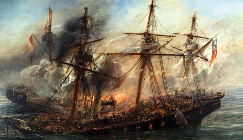 Thomas Somerscales (1886) Cuadro del Combate Naval de Iquique que muestra a la corbeta Esmeralda en sus momentos finales con la cubierta repleta de tripulantes caídos mientras un oficial ordena seguir combatiendo y el Huáscar la arremete por tercera vez. Destaca por su fuerza dramática, precisión histórica y maestría técnica.